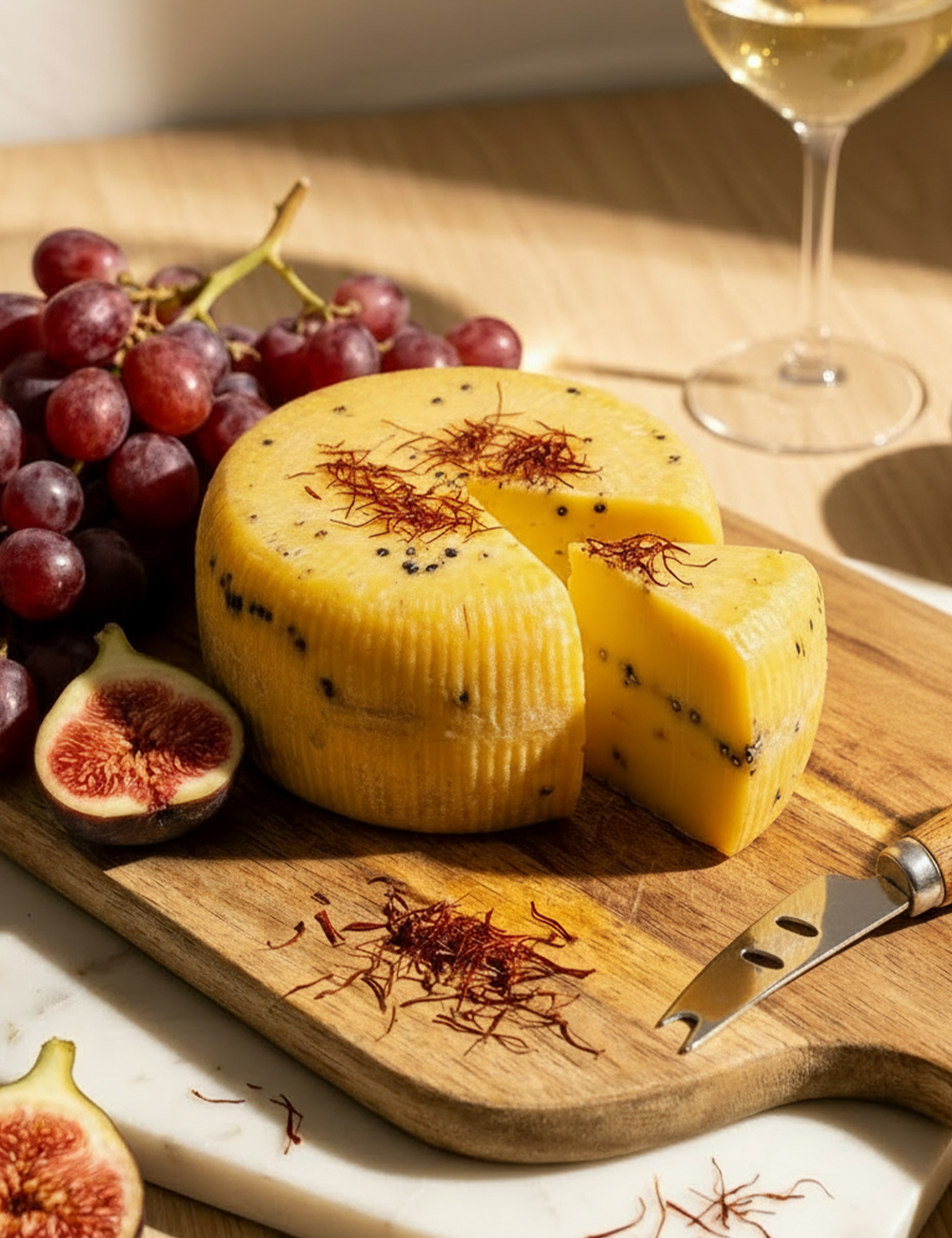 Il Formaggio San Nicola allo Zafferano è un formaggio stagionato di pecora, realizzato artigianalmente secondo la tradizione casearia siciliana. L’aggiunta dello zafferano conferisce al formaggio un colore giallo intenso e un profilo aromatico unico, bilanciato da un leggero tocco di pepe nero che ne esalta il gusto.